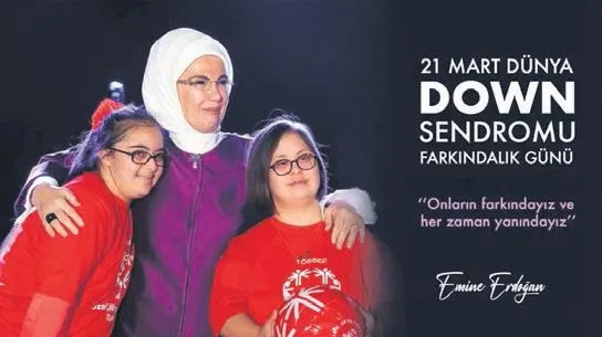 EMİNE Erdoğan, 21 Mart Dünya Down Sendromu Farkındalık Günü dolayısıyla yayınlanan Twitter mesajında "Bugün, 21 Mart Dünya Down Sendromu Farkındalık Günü.
