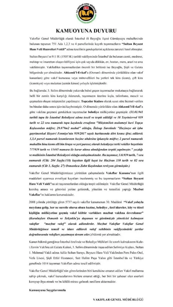 Vakıflar Genel Müdürlüğü, konuyla alakalı yeni bir açıklamanın hasıl olduğunu ifade ederek, "Vakıflar Genel Müdürlüğü olarak İstanbul ili Beyoğlu ilçesi Gümüşsuyu mahallesinde bulunan tapunun 751 Ada 1,2,3 ve 4 parsellerinde kayıtlı taşınmazların 'Sultan Beyazıt Hanı Veli Hazretleri Vakfı' adına tescilinin gerekçelerini açıklama zarureti hasıl olmuştur" dedi. İşte o açıklama: