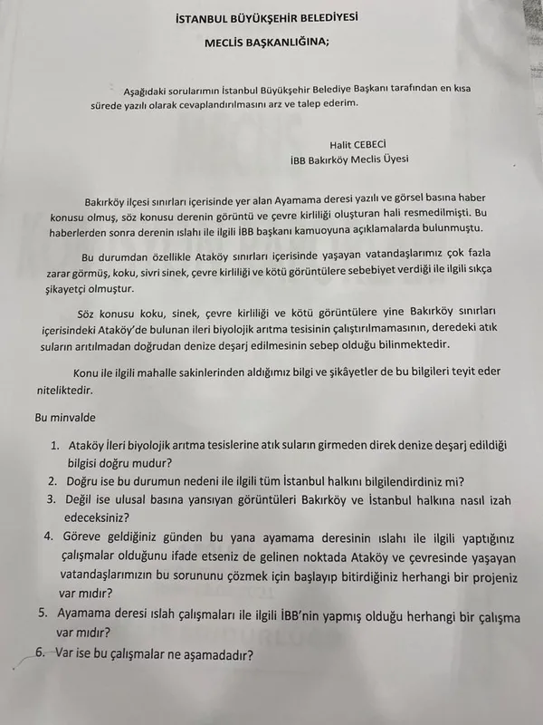 Geçtiğimiz günlerde İstanbul Büyükşehir Belediyesi'nin (İBB), Ataköy İleri Biyolojik Atıksu Arıtma Tesisi'ni çalıştırmamasından dolayı oluşan çevre kirliliği tepkilere neden olmuştu. Bakırköy'de bulunan Ayamama Deresi üzerinden denize deşarj edilen kirli suyun hala akmaya devam ettiği ortaya çıktı. AK Parti Bakırköy Meclis Üyesi Halit Cebeci, konuyla ilgili İBB meclisine soru önergesi verdiğini fakat İBB'nin bu hususta henüz hiçbir açıklama yapmadığını söyledi. Yaşanan çevre felaketinin takipçisi olduğunu belirten Halit Cebeci, "Bizzat kendim tesise girdim. Aldığım kayıtlar var. Tesisin çalıştırılmadığı ortada. Yaşanan sorunun daha çok büyümemesi için biran önce İBB adım atmalıdır" dedi.