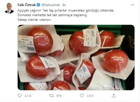 CHP Sözcüsü Faik Öztrak, Gazeteci İlhami Işık, Ekonomist Özgür Demirtaş gibi isimler ardı ardına twittler atmaya başladı. Öztrak, CHP yönetimi döneminde ekmeğin karneyle satıldığını unutarak "Ayçiçek yağının "tek taş pırlanta" muamelesi gördüğü ülkemde; Domates markette tek tek satılmaya başlamış. Sebep olanlar utansın" yorumunda bulundu.