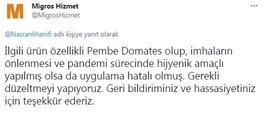 Bir marketin satış planlamasının sanki Türkiye'de bir krizin göstergesi gibi algı çabaları üzerine Migros açıklama yaparak "kriz tellallarını" yalanladı. Migros Hizmet isimli sosyal medya hesabından yapılan açıklamada amacın imhaların önlenmesi ve pandemi sürecinde hijyen olduğu vurgulandı. Açıklamada "İlgili ürün özellikli Pembe Domates olup, imhaların önlenmesi ve pandemi sürecinde hijyenik amaçlı yapılmış olsa da uygulama hatalı olmuş. Gerekli düzeltmeyi yapıyoruz. Geri bildiriminiz ve hassasiyetiniz için teşekkür ederiz" denildi.