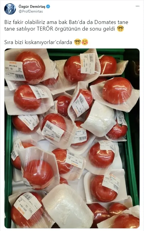 Ekonomist Özgür Demirtaş da kendince ironi yaparak "Biz fakir olabiliriz ama bak Batı'da da Domates tane tane satılıyor TERÖR örgütünün de sonu geldi Sıra bizi kıskanıyorlar'cılarda" şeklinde paylaşım yaptı.