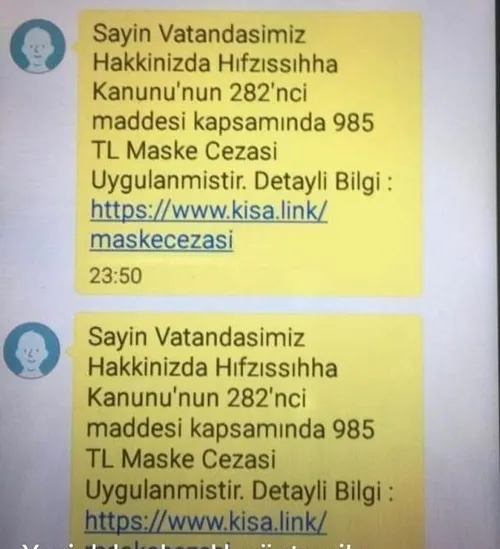 Dolandırıcılar tarafından son günlerde cep telefonlarına "Sayın vatandaşımız hakkınızda Hıfzıssıhha Kanunu'nun 282'nci maddesi kapsamında 985 TL maske cezası uygulanmıştır." ifadeleri ile bağlantı linkinin yer aldığı mesaj gönderildiği aktarılan paylaşımda, bu tür mesajın gelmesi halinde bağlantı linkine tıklanmaması uyarısında bulunuldu. Paylaşımda, "Dolandırıcıların oltasına düşmeyelim. Güvenilirliğinden emin olmadığımız bağlantılara tıklamayalım. Güvenilir bilgi için resmi kaynakları takip edelim." ifadeleri yer aldı.