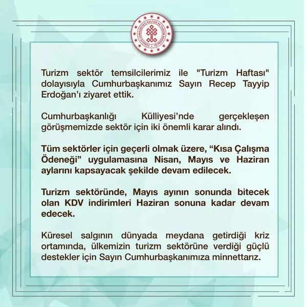 "Turizm sektöründe, mayıs ayının sonunda bitecek olan KDV indirimleri haziran sonuna kadar devam edecek. Küresel salgının dünyada meydana getirdiği kriz ortamında, ülkemizin turizm sektörüne verdiği güçlü destekler için Sayın Cumhurbaşkanımıza minnettarız."