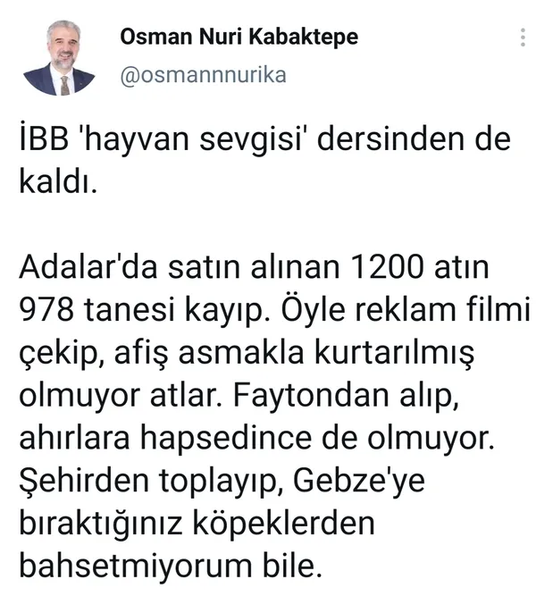 AK Parti İstanbul İl Başkanı Osman Nuri Kabaktepe de sosyal medya hesabından, "İBB 'hayvan sevgisi' dersinden de kaldı. Adalar'da satın alınan 1200 atın 978 tanesi kayıp. Öyle reklam filmi çekip, afiş asmakla kurtarılmış olmuyor atlar. Faytondan alıp, ahırlara hapsedince de olmuyor. Şehirden toplayıp, Gebze'ye bıraktığınız köpeklerden bahsetmiyorum bile" dedi.