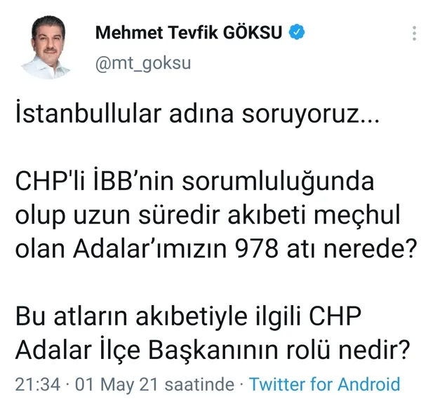 Göksu, "İstanbullular adına soruyoruz... CHP'li İBB'nin sorumluluğunda olup uzun süredir akıbeti meçhul olan Adalar'ımızın 978 atı nerede? Bu atların akıbetiyle ilgili CHP Adalar İlçe Başkanının rolü nedir?" ifadelerini kullandı.