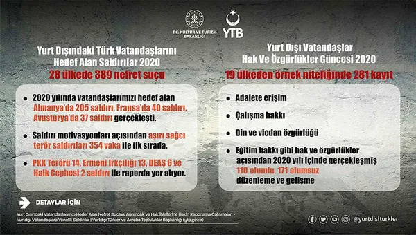 Yurtdışı Türkler ve Akraba Topluluklar Başkanlığı, 2020'de yurt dışında yaşayan vatandaşlarımıza yapılan saldırıları raporunu yayımladı. Yurtdışı Türkler ve Akraba Topluluklar (YTB) Başkanı Abdullah Eren'in sosyal medya hesaplarından da paylaşılan rapor, farklı dillerde yayımlandı. Rapora göre, 28 ülkede 389 vatandaşımız saldırıya uğrarken, 19 ülkede hak ve özgürlüklere dair 171 olumsuz düzenleme yapıldı. En fazla saldırı Almanya, Fransa ve Avusturya'da gerçekleştirildi.