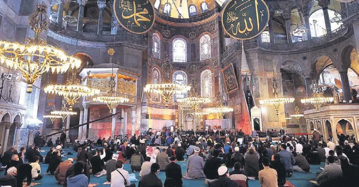 İstanbul'un fethinin simgesi sayılan Ayasofya Camisi'nde 87 yıl sonra ilk kez Ramazan Bayramı namazı kılındı. Vatandaşlar caminin içinde ve dışında sosyal mesafe ve maske kuralına uyularak namazlarını kıldı. Diyanet İşleri Başkanı Prof. Dr. Ali Erbaş minbere kılıçla çıktı. Erbaş'ın kıldırdığı namazda TBMM Başkanı Mustafa Şentop ile Ulaştırma ve Altyapı Bakanı Adil Karaismailoğlu da saf tuttu. Erbaş bayram hutbesinde, "İslam coğrafyasının mazlum beldelerinden yükselen feryatlar kalbimizi derinden yaralamakta. Ramazanda bile saldırgan tavrından vazgeçmeyen İsrail'in, Kudüs'ü ve ilk kıblemiz Mescid-i Aksa'yı işgal girişimi tüm müminleri büyük bir hüzne ve acıya gark etmektedir" dedi. Şentop ise, "Kudüs ve Mescid-i Aksa'da barış ve huzur sağlanmadığı sürece başta Orta Doğu olmak üzere bütün dünyada barışın tesis edilebilmesi mümkün değil" diye konuştu.