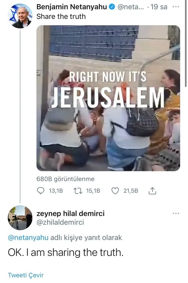 Zeynep Hilal Demirci, İsrail Başbakanı Benyamin Netanyahu'nun paylaşımının altına "Tamam mı? Ben gerçeği paylaşıyorum" ifadeleriyle cevap verdi ve hazırladığı videoyu paylaşımına etiketledi.