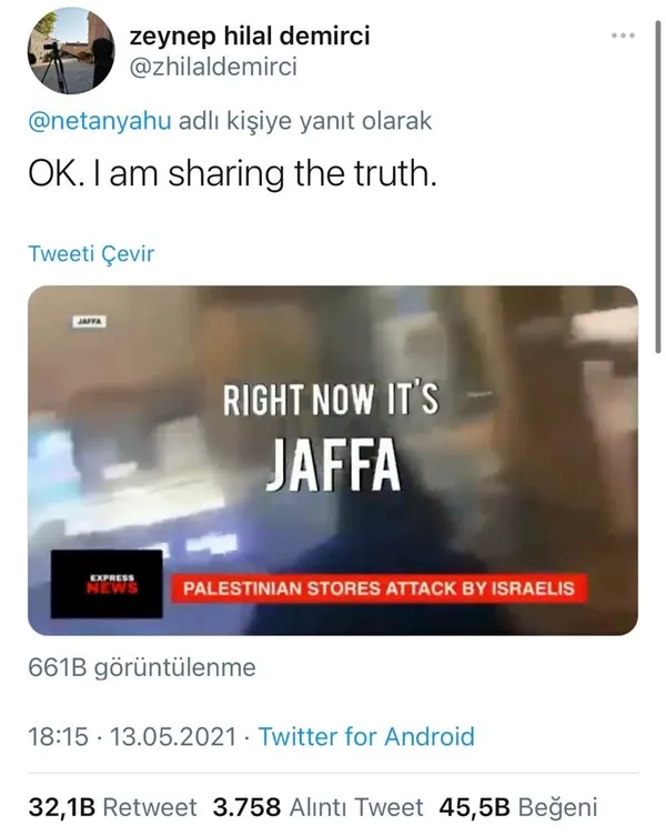 İsrail Başbakanı Benyamin Netanyahu'nun ülkesinin Mescid-i Aksa ve Gazze'ye yapılan saldırıları meşru göstermek için sosyal medyadan başlattığı kirli algı operasyonun büyük tepkilere neden oldu. Zeynep Hilal Demirci’nin Netanyahu’ya cevap verdiği video İsrail Başbakan'ının kirli algı operasyonunu çökertti.