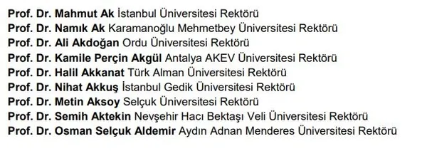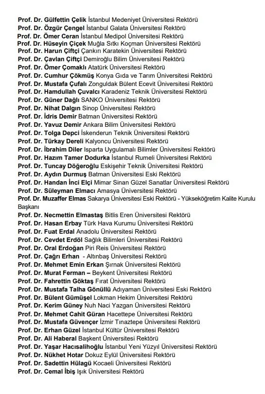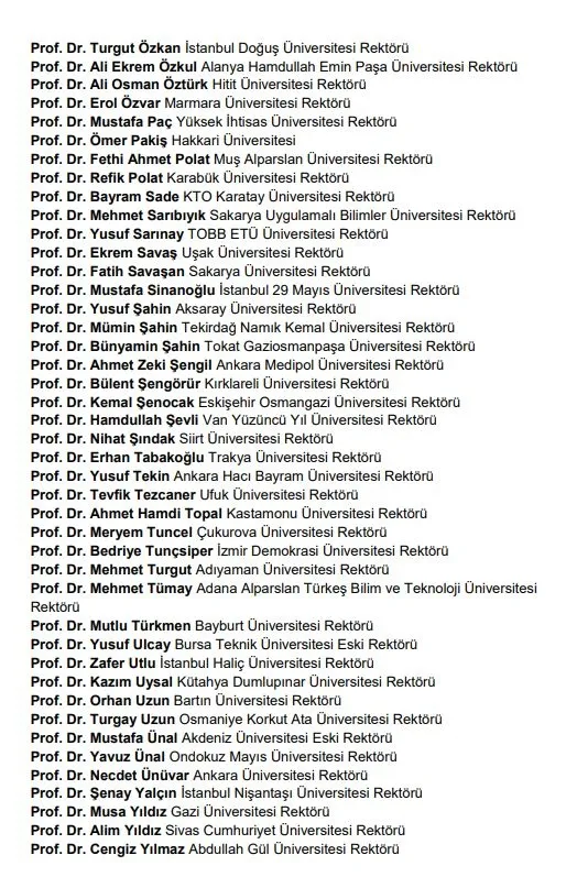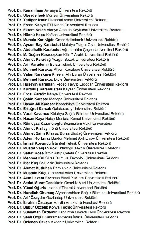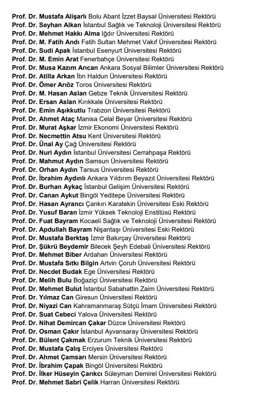 Türkiye genelinde bildiriye imza atan 189 üniversite rektörülerin isimleri ise şu şekilde: