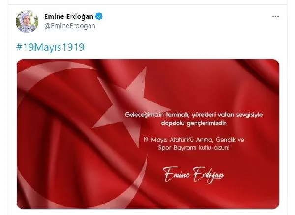 Cumhurbaşkanı Recep Tayyip Erdoğan'ın eşi Emine Erdoğan, 19 Mayıs Atatürk'ü Anma, Gençlik ve Spor Bayramı'nı kutladı.