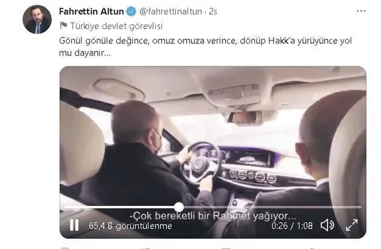 CUMHURBAŞKANLIĞI İletişim Başkanı Fahrettin Altun, Twitter'dan Cumhurbaşkanı Erdoğan'ın önceki gün Kuzey Marmara Otoyolu Habipler ve Hasdal Kavşağı açılış töreninden sonra Fatih Camisi'ne kadar makam aracını kullandığı anların görüntülerini paylaştı. Yağmur altında yaptığı yolculuk sırasında "Çok bereketli bir rahmet yağıyor" yorumunu yapan Erdoğan'ın yol boyunca sanatçı Ömer Karaoğlu'nun "Yol mu dayanır" ezgisini dinlediği görüldü. ANKARA