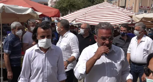CHP İlçe Başkanı Coşkun Karadağ ve partililer ile birlikte Cuma Pazarı'nın içerisinden geçtikleri sırada bir zabıta memuru Budak'a maske takması için uyarıda bulundu.