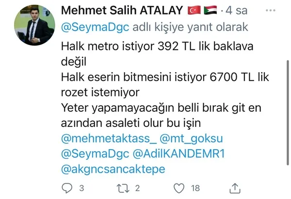 İBB'nin Sancaktepe Yenidoğan Metro Hattı'nın temelinin hafriyat dökülerek kapatılmak istenmesine sosyal medya hesaplarından tepkilerini dile getirenlerden biri de AK Parti Sancaktepe İlçe Gençlik Kolları Yerel Yönetimler Birim Başkanı Mehmet Salih Atalay oldu.