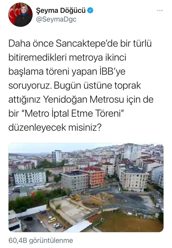 AK Parti İBB döneminde yapımına başlanan Sancaktepe Yenidoğan Metro Hattı’nın CHP’li İBB tarafından temeline hafriyat dökülerek kapatıldığını gösteren görüntüler sosyal medyada büyük tepki çekti. Sancaktepe Belediye Başkanı Şeyma Döğücü İBB’ye tepki göstererek “Daha önce Sancaktepe’de bir türlü bitiremedikleri metroya ikinci başlama töreni yapan İBB’ye soruyoruz. Bugün üstüne toprak attığınız Yenidoğan Metrosu için de bir ‘Metro İptal Etme Töreni’ düzenleyecek misiniz?” ifadelerini kullandı. İBB’nin Sancaktepe Yenidoğan Metro Hattı’nın temelini kapatma eylemine sosyal medyadan da tepki yağdı. İşte o tepkiler: