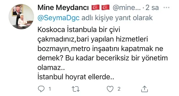AK Parti Sancaktepe İlçe Yönetim Kurulu Üyesi Mine Meydancı ise "Koskoca İstanbul'a bir çivi çakmadınız, bari yapılan hizmetleri bozmayın, metro inşaatını kapatmak ne demek? Bu kadar beceriksiz bir yönetim olamaz.. İstanbul hoyrat ellerde" diyerek tepkisini gösterdi.