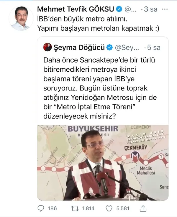 Esenler Belediye Başkanı ve İBB AK Parti Grup Başkanvekili M. Tevfik Göksu da İBB'nin metro hattının temelini kapatmasına "İBB'den büyük metro atılımı. Yapımı başlayan metroları kapatmak" diyerek tepkisini ortaya koydu.