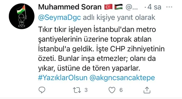 AK Parti Sancaktepe İlçe Gençlik Kolları Yönetim Kurulu Üyesi ve Tanıtım Medya Başkan Yardımcısı Muhammed Soran ise "Tıkır tıkır işleyen İstanbul'dan metro şantiyelerinin üzerine toprak atılan İstanbul'a geldik. İşte CHP zihniyetinin özeti. Bunlar inşa etmezler; olanı da yıkar, üstüne de tören yaparlar" yorumunu yaptı.
