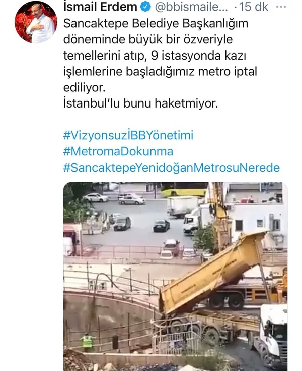 Sancaktepe Kurucu Belediye Başkanı ve AK Parti Ataşehir İlçe Başkanı İsmail Erdem, Sancaktepe Belediyesi Başkanlığı döneminde Sancaktepe Yenidoğan Metro Hattı'nın büyük bir özveriyle temelinin atıldığını hatırlatarak İBB'ye sosyal medyadan tepki gösterdi. Başkan İsmail Erdem, "Sancaktepe Belediye Başkanlığım döneminde büyük bir özveriyle temellerini atıp, 9 istasyonda kazı işlemlerine başladığımız metro iptal ediliyor. İstanbul'lu bunu hak etmiyor" ifadelerini kullandı.