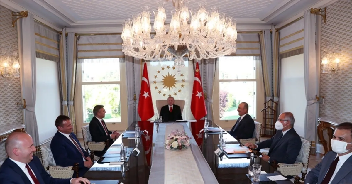 Erdoğan'a kabulde, Dışişleri Bakanı Mevlüt Çavuşoğlu, Cumhurbaşkanlığı İletişim Başkanı Fahrettin Altun, Cumhurbaşkanlığı Sözcüsü İbrahim Kalın, AK Parti Sözcüsü Ömer Çelik ve AK Parti Genel Başkan Yardımcısı Efkan Ala da eşlik etti.