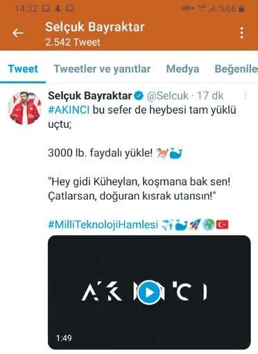 BAYRAKTAR AKINCI TİHA (Taarruzi İnsansız Hava Aracı), toplam 3000 libre yani bin 360 kilogram faydalı yükle 13 saat 24 dakika uçuş gerçekleştirdi. BAYKAR açıklamasına göre, kalkış ağırlığı 6 tonu geçen AKINCI, tam yüke yakın faydalı yük ile güçlü bir performans sergileyerek 30 bin feet (9 bin 144 metre) irtifaya kadar yükseldi. 9 Temmuz'da gerçekleşen uçuşta gövde altında TÜBİTAK SAGE tarafından yerli olarak geliştirilen NEB (Nüfuz Edici Bomba) ile havalanan AKINCI, bu uçuşta 13 saat 24 dakika havada kaldı.
