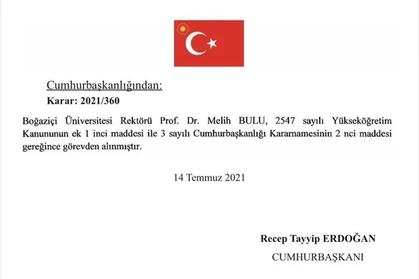 "Boğaziçi Üniversitesi Rektörü Prof. Dr. Melih Bulu, 2547 sayılı Yükseköğretim Kanununun ek 1 inci maddesi ile 3 sayılı Cumhurbaşkanlığı Kararnamesinin 2 inci maddesi gereğince görevden alınmıştır."