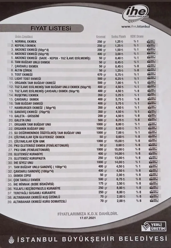 İŞTE İBB HALK EKMEK'İN ZAMLI EKMEK FİYAT LİSTESİ: