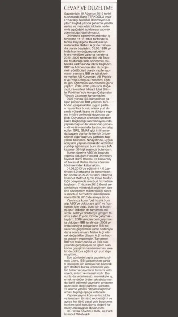 Cumhuriyet Gazetesi'nden Barış Pehlivan 2008 yılında İBB personelinin eğitim alması için yurt dışına burslu olarak gönderilmesini köşesine taşıdı. Pehlivan İBB Başkanı Ekrem İmamoğlu'nun AK Parti milletvekilinin İBB ile ilişkisine dair bir müfettiş görevlendirdiğini ve bir rapor hazırlandığını ifade etti. Pehlivan, İBB şirket personelinin yurt dışında eğitim görebilmesi için 4 Ağustos 2008'de bir karar alındığını belirterek bu karardan sonra Kavakçı'nın ABD'deki Howard Üniversitesi'nin doktora bölümüne 24 Kasım 2008'de kabul edildiğini yazdı. Pehlivan, daha önce Cumhuriyet'in aynı konuda tekzip yayınlamasına rağmen yazısında Ravza Kavakçı Kan'ın İstanbul Ulaşım AŞ'ye 1 Aralık 2008 tarihinde iş başvurusunda bulunduğunu yazdı.