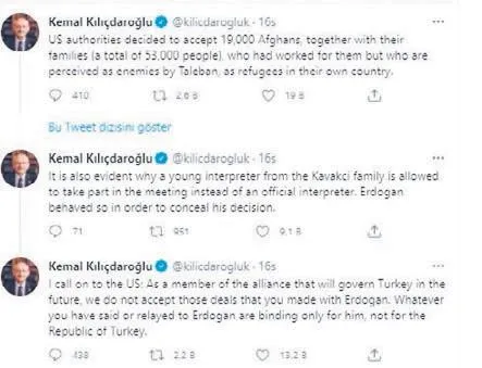 Türkiye'nin net tavrı yanında durması beklenen Cumhuriyet Halk Partisi (CHP) Genel Başkanı Kemal Kılıçdaroğlu ise ABD ile Türkiye arasında Afgan göçmenlerin Türkiye'ye gelmesi konusunda gizli anlaşma yapıldığı iftirasında bulunarak algı oluşturmaya çalıştı. Kılıçdaroğlu İngilizce olarak Twitter üzerinden paylaştığı mesajında, "Öncelikle şu aşikârdır ki; Erdoğan son yaptığı görüşmede ülkemize bu Afgan sığınmacıları kabul etmiştir. ABD'ye sesleniyorum: Erdoğan ile yaptığınız bu anlaşmaları, geleceğin iktidar üyesi ve ülkeyi yönetecek ittifak olarak asla kabul etmiyoruz. Kendisine ne dediyseniz, neler söylediyseniz, bunlar Erdoğan'ı bağlar, Türkiye Cumhuriyeti'ni bağlamaz. Beka sorunumuz haline gelen bu meselenin örtbas edilmesine izin veremem" ifadelerine yer verdi.