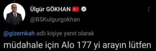 Ülgür Gökhan'ın bu yanıtı sosyal medyadan büyük tepki alırken, yardım çağrısında bulunan vatandaş, " Alo 177 zaten arandı ve bölgede ekipler mevcut. Ben sadece kahramanlık destanlarının yazıldığı bu topraklarda sizin de bir destanınız olsun istedim. Yardım çığlığımıza 177'li yanıt. " yazdı.