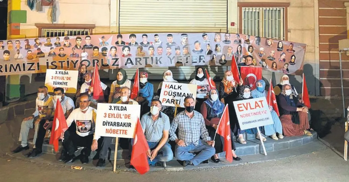 Diyarbakır HDP İl Binası önünde terör örgütü PKK tarafından dağa kaçırılan çocukları için 720 gündür evlat nöbeti tutan aileler, eylemlerini nöbetin 3 Eylül'de 2'nci yıla girecek olması nedeniyle 7/24 sürdürme kararı aldı. HDP binası önünde önceki gece bir araya gelen aileler, "Otura otura zafer bizim olacak", "Kahrolsun PKK işbirlikçi HDP", "Hepimiz askeriz PKK'yı yeneriz" şeklinde sloganlar attı. Diyarbakır'daki eylemi başlatan ve bir süre önce terör örgütünden kaçıp teslim olan oğlu Mustafa'ya kavuşan kanser hastası anne Ayşegül Biçer, "Bu eylem bir kişi ile başladı, çığ gibi büyüdü. PKK'ya 'Yeter artık (edi bese)' demek istiyorsak tüm anneleri buraya davet ediyoruz. Sanatçılar, insan hakları savunucuları, akademisyenler, çocuk hakları savunucuları artık bu anneleri görsün. Tüm siyasi partilere de çağrımızdır, gelin bu anne ve babaların feryadını görün. Kürtlerin sözde haklarını Meclis'te savunuyorum diyen HDP burada 720 gündür, annelerin ve babaların sesini duymadı. Evladına kavuşan bir anne olarak buradaki ailelere desteğim sürecektir. Gece gündüz demeden 7/24 evlatlarımızı PKK ve HDP'den istiyoruz. Biz anneler olarak çocuklarımızın ölümüne izin vermemeliyiz. Bunu durdurmak için 3 Eylül'de herkesi buraya davet ediyoruz" dedi.