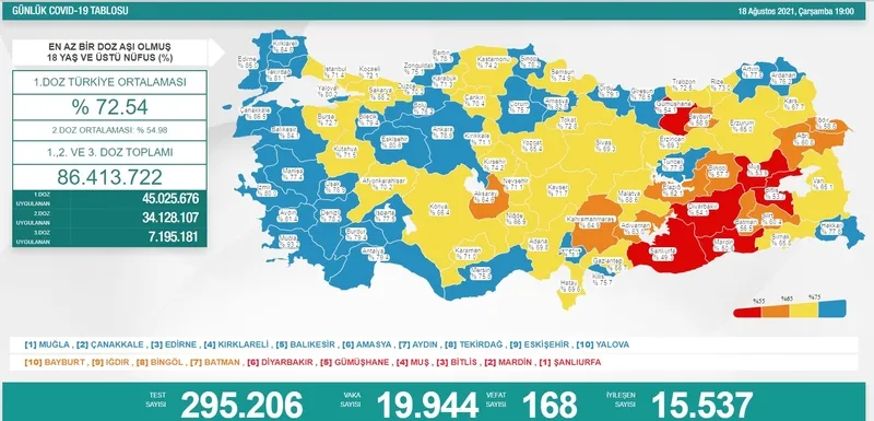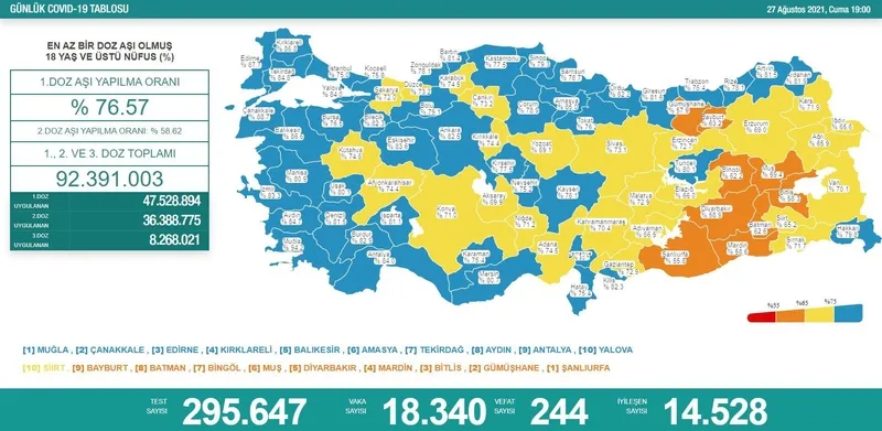 Yurt ve dünyada 1 yıldan fazla bir süredir etkilerini göstermeye devam eden covid-19 pandemisine ilişkin yerli ve yabancı ajanslardan “corona virüsü son dakika” haberleri peş peşe gelmeye devam ediyor. Sağlık Bakanı Fahrettin Koca Twitter hesabı ve Sağlık Bakanlığı resmi internet sitesi üzerinden ilk vakadan itibaren paylaşılan en son Türkiye corona virüs tablosu verilerine göre bugün corona virüs testi yaptıranlardan 18 bin 340 kişi pozitif sonuçla tedavi edilmeye başlandı. Öte yandan bugünkü Türkiye'de güncel koronavirüs vaka ve vefat rakamları öğrenilmek istenerek 27 Ağustos koronavirüs tablosu açıklandı mı, corona virüsü son dakika vaka - vefat sayısı kaç oldu? soruları üzerinden bilgi edinilmeye çalışılıyor. 27 Ağustos korona tablosu ile birlikte bugünkü Türkiye corona virüsü vaka – vefat sayıları.