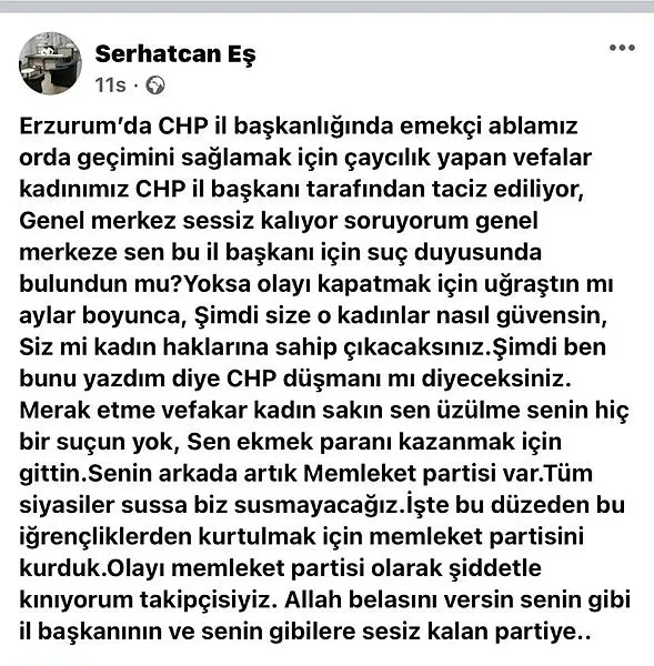 Son dakika: Erzurum CHP İl Başkanı Bülent Oğuz, partide görevli çaycı kadını taciz etti. Taciz konuşmaları internete düştü. Kayıtlarda, ekmek mücadelesi verdiğini söyleyen kadına il başkanı, “Çok hoşuma gidiyorsun” diyor. Diğer yandan edinilen son dakika bilgisine göre CHP Erzurum İl Başkanı Bülent Oğuz hakkında, bir kadına sözlü tacizde bulunduğu iddiasıyla soruşturma başlatıldı.