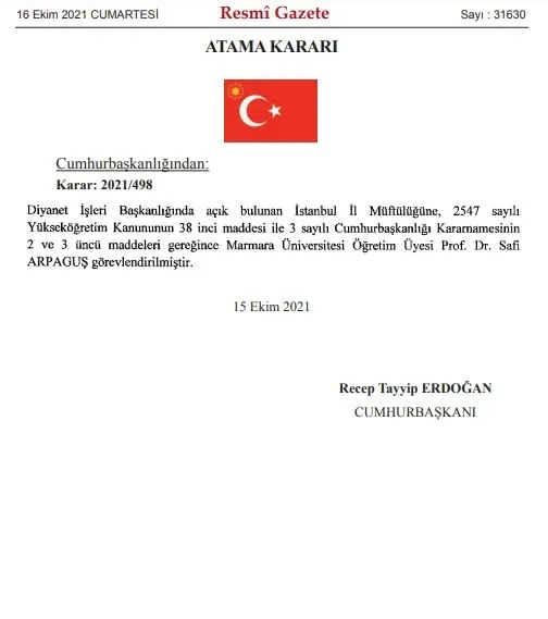 Resmi Gazete'de yayımlanan atama kararına göre; İstanbul İl Müftülüğüne Marmara Üniversitesi Öğretim Üyesi Prof. Dr. Safi Arpaguş atandı.