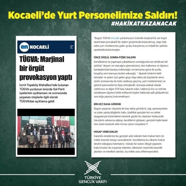 Türkiye Gençlik Vakfı (TÜGVA) Kocaeli Yurdu önünde Sol Parti üyeleri bir açıklama yapmak istedi. Bu esnada yurt müdürü açıklama yapanları uyardı. TÜGVA'dan yapılan açıklamaya göre bu uyarı sonrasında Sol Parti üyeleri önce sözlü sonrasında da fiziki saldırıya geçerek yurt müdürünü ve görevli personeli darp etti.