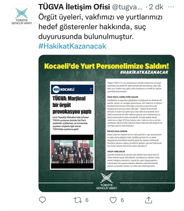 TÜGVA’dan yapılan açıklamaya göre; TÜGVA Kocaeli Yurdu önünde Sol Parti üyeleri açıklama yapınca yurt müdürü açıklama yapanları uyardı. Bu uyarıdan sonra Sol Parti’nin üyeleri önce sözlü sonrasında da fiziki saldırıya geçerek yurt müdürünü ve görevli personeli darp etti. TÜGVA’dan “Kocaeli’de yurt personelimize saldırı” başlıklı yapılan açıklamada, “Örgüt üyeleri, vakfımızı ve yurtlarımızı hedef gösterenler hakkında, suç duyurusunda bulunulmuştur” ifadeleri kullanıldı. İşte açıklamanın detayları...