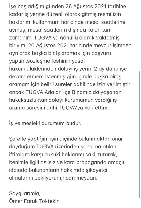 Ayrıca Toktekin "26 Ağustos 2021 tarihinde mevcut işimden ayrılarak başka bir iş aramak için başvuru yaptım, sözleşme feshinin yasal hükümlülüklerinden dolayı iş yerim 2 ay daha işe devam etmem istenmiş gün içinde başka bir iş aramam için belirli süreler dâhilinde izin verilmiştir ancak TÜGVA Adalar İlçe Binamız'da yaşanan hukuksuzluktan dolayı kurumumun verdiği iş arama süresini dahi TÜGVA'ya vakfettim. İş ve mesleki durumum budur" ifadelerini kullandı.