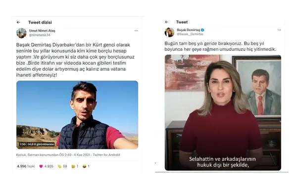 HDP'nin tutuklu eski Eş Genel Başkanı Selahattin Demirtaş'ın eşi Başak Demirtaş'ın sosyal medya hesabından yaptığı 5. yıl paylaşımına Diyarbakırlı Kürt genci Umut Nimet Aktaş'tan tokat gibi sözlerle tepki geldi.