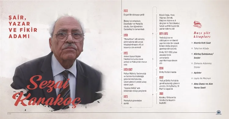 Şair, yazar ve fikir adamı Sezai Karakoç, 88 yaşında hayatını kaybetti. Henüz çocuk yaşlarda okuma aşkıyla büyüyen Karakoç, 1950'li yıllarda kaleme aldığı, Türk edebiyatının en sevilen şiirlerinden biri haline gelen "Mona Rosa" ile okuyucunun kalbinde taht kurdu