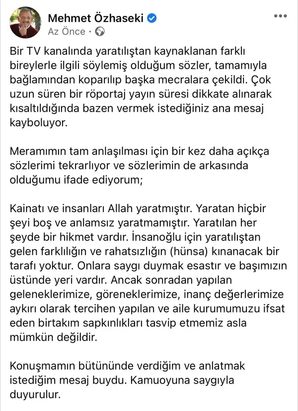 Twitter hesabından yaptığı açıklamada Özhaseki şunları söyledi: "Bir TV kanalında yaratılıştan kaynaklanan farklı bireylerle ilgili söylemiş olduğum sözler, tamamıyla bağlamından koparılıp başka mecralara çekildi. Çok uzun süren bir röportaj yayın süresi dikkate alınarak kısaltıldığında bazen vermek istediğiniz ana mesaj kayboluyor. Meramımın tam anlaşılması için bir kez daha açıkça sözlerimi tekrarlıyor ve sözlerimin de arkasında olduğumu ifade ediyorum. Kainatı ve insanları Allah yaratmıştır. Yaratan hiçbir şeyi boş ve anlamsız yaratmamıştır. Yaratılan her şeyde bir hikmet vardır. İnsanoğlu için yaratılıştan gelen farklılığın ve rahatsızlığın (hünsa) kınanacak bir tarafı yoktur. Onlara saygı duymak esastır ve başımızın üstünde yeri vardır."