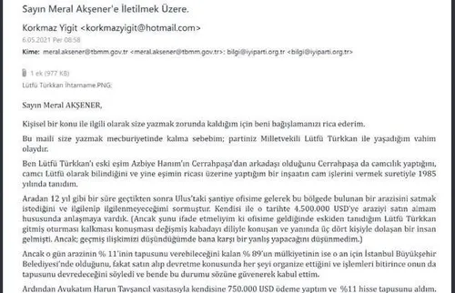 Bingöl'de şehit ağabeyine küfürler savuran İYİ Parti Kocaeli Milletvekili Lütfü Türkkan'ın işadamı Korkmaz Yiğit'i yüzde 89'luk hissesi İBB'ye ait olan arazinin satışı için 3 milyon 750 bin dolar dolandırmasıyla ilgili yeni ayrıntılar ortaya çıktı. Yiğit'in önce 21 Aralık 2020'de Türkkan'a, "Lütfü kardeşim seni 1985 yılında tanıdım. Bana 'düşünüp sana döneceğim' demiştin ama dönmedin" yazdığı bir mail attığı öğrenildi.