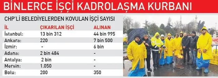 31 Mart seçimlerinin ardından İstanbul Büyükşehir Belediyesi'nde 'tasarruf' adı altında 13 bin 312 işçi kapının önüne konuldu. 2019'dan bu yana ise 44 bin 995 kişi işe alındı. Ankara Büyükşehir Belediyesi'nde 220 personel çıkarılırken, 7 bin 500 kişi işe alındı. İzmir'de 2019 yılında çalışan sayısı 27 bin 345'ken, 1 Haziran 2020'de bu sayı tam 28 bin 558'e çıktı. Tunç Soyer'in seçilmesinin ardından bugüne kadar büyükşehirde 6 bin kişiye iş verildi. Adana Büyükşehir Belediyesi'nde, 2 bin 484 kişi işten çıkartılırken, Antalya Büyükşehir Belediyesi'nde 2 bini aşkın işçinin görevine son verildi. Mersin Büyükşehir Belediyesi bin 50 işçiyi ekmeğinden ederken, Tanju Özcan döneminde Bolu Belediyesi ve iştiraki olduğu şirketlerde, 350 civarında personel alındı. 200'ye yakın işçi de çıkarıldı.