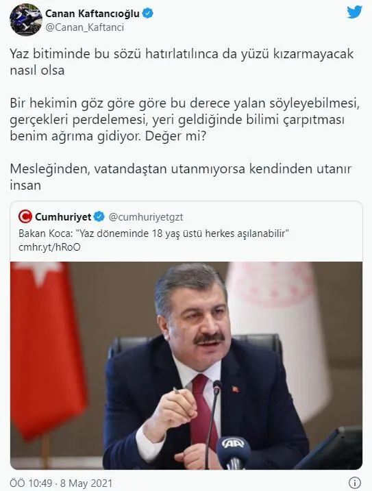 Kaftancıoğlu, 8 Mayıs 2021 tarihinde, Bakan Koca'nın "Yaz bitiminde 18 yaş ve üstü herkes aşılanabilir" açıklamasını alıntılayarak, "Yüzü kızarmayacak nasıl olsa" diyerek 'yalancılıkla' suçlamıştı.