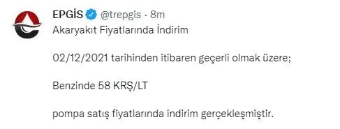 Enerji Petrol Gaz İkmal İstasyonları İşveren Sendikası'ndan (EPGİS) yapılan açıklamaya göre bu geceden itibaren geçerli olmak üzere benzinin litre fiyatına 58 kuruş indirim geldi.