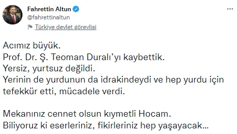 İletişim Başkanı Fahrettin Altun: Acımız büyük. Prof. Dr. Ş. Teoman Duralı'yı kaybettik. Yersiz, yurtsuz değildi. Yerinin de yurdunun da idrakindeydi ve hep yurdu için tefekkür etti, mücadele verdi. Mekanınız cennet olsun kıymetli Hocam. Biliyoruz ki eserleriniz, fikirleriniz hep yaşayacak…