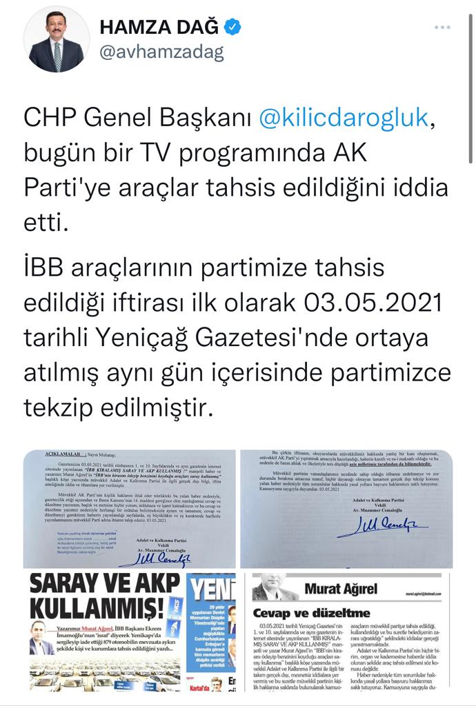 Dağ sosyal medya platformu Twitter'dan şunları söyledi: "CHP Genel Başkanı Kemal Kılıçdaroğlu,, bugün (dün) bir TV programında AK Parti'ye araçlar tahsis edildiğini iddia etti. İBB araçlarının partimize tahsis edildiği iftirası ilk olarak 03 Mayıs 2021 tarihli Yeniçağ Gazetesi'nde ortaya atılmış aynı gün içerisinde partimizce tekzip edilmiştir."