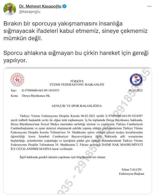 Son dakika açıklamasında bulunan Gençlik ve Spor Bakanı Muharrem Kasapoğlu, Başkan Recep Tayyip Erdoğan'ın sağlık durumu ile ilgili çirkin ifadeler kullanan eski milli yüzücü Derya Büyükuncu hakkında soruşturma başlatıldığı ve daimi hak mahrumiyeti cezası verildiğini duyurdu.