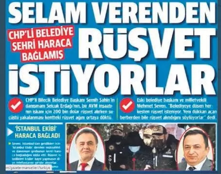 CHP, SABAH'ın duyurduğu rüşvet skandalına adı karışan Bilecik Belediye Başkanı Semih Şahin'i disipline sevk etti. Şahin'in danışmanı ve belediye iştiraki Kayı A.Ş. Yönetim Kurulu Başkanı Selçuk Erdağı, bir AVM inşaatının iskanı için 200 bin dolar rüşvet alırken suçüstü yakalanmıştı.