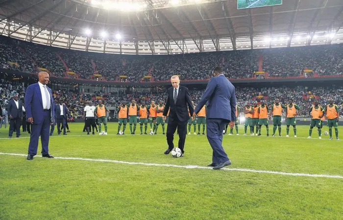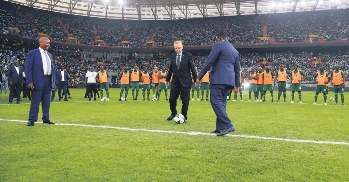 Sahaya çıkarken bazı futbolcularla sohbet eden Erdoğan, daha sonra orta sahada Sall ve diğer devlet başkanlarıyla pas yaptı. Gala maçı için sahaya çıkan Afrikalı eski oyuncular ve Senegal Milli Takımı'nın eski oyuncularıyla selamlaşan Erdoğan, mevkidaşı Sall ve diğer devlet başkanları futbolcularla paslaştı.
